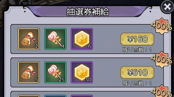 抽選券補給パック:指揮官や封印物などを引けるガチャ券を複数まとめて獲得できる中価格帯のパック。特に「初回購入限定」「お得価格」の場合アリ。
